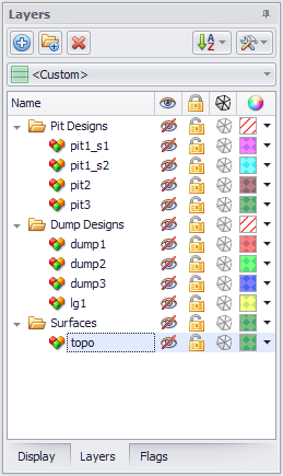 Use the Layers panel to import Pit and Dump designs and topographic surfaces.