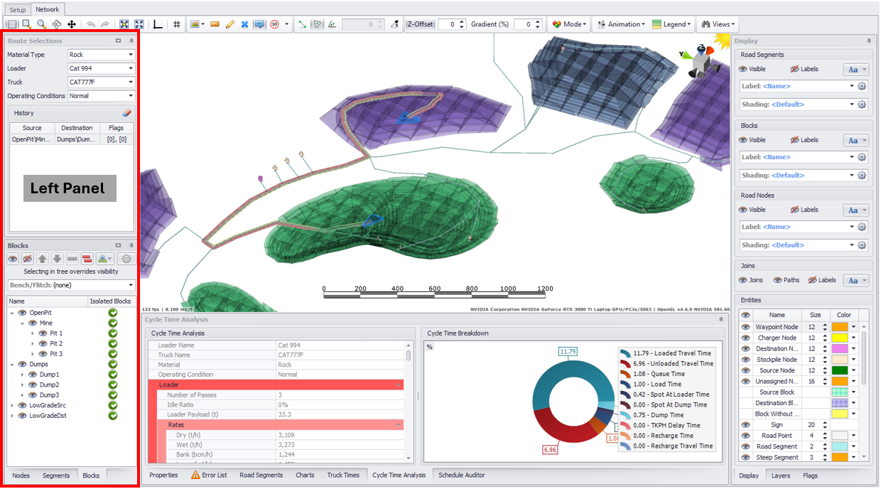 On the left-hand side of the Network tab there is a panel which comprises upper and lower panes: Route Selections and a History pane at the top; Nodes, Segments and Blocks panes at the bottom.