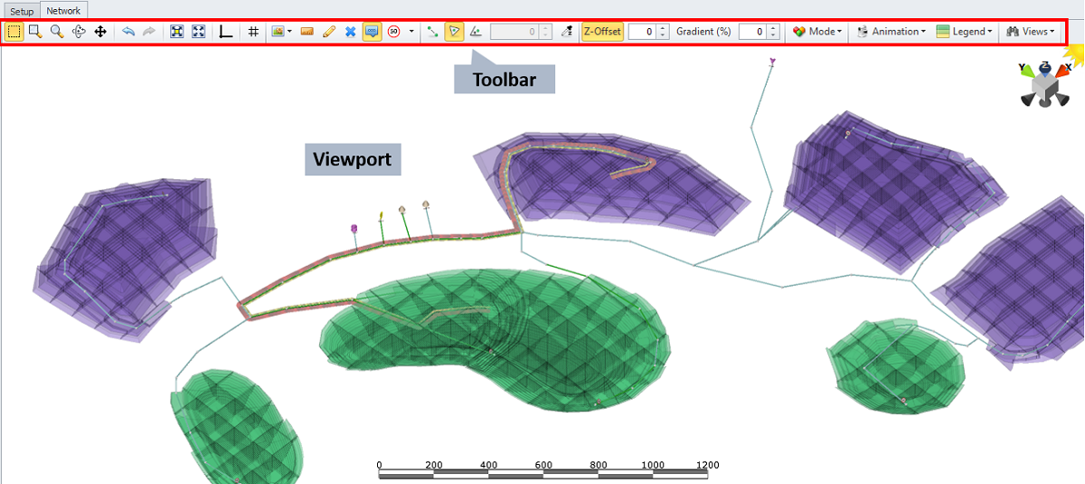 On the Network tab, the Viewport is the main area to draw and interact with the road network and mine elements. Use the tools and options on the Toolbar to interact with the haul network in the Viewport.