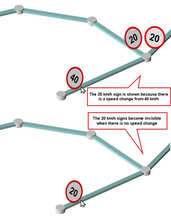 Add a 40 km/h sign over the top of the 20 km/h sign -> the sign will disappear, because there is no speed change along the segment.