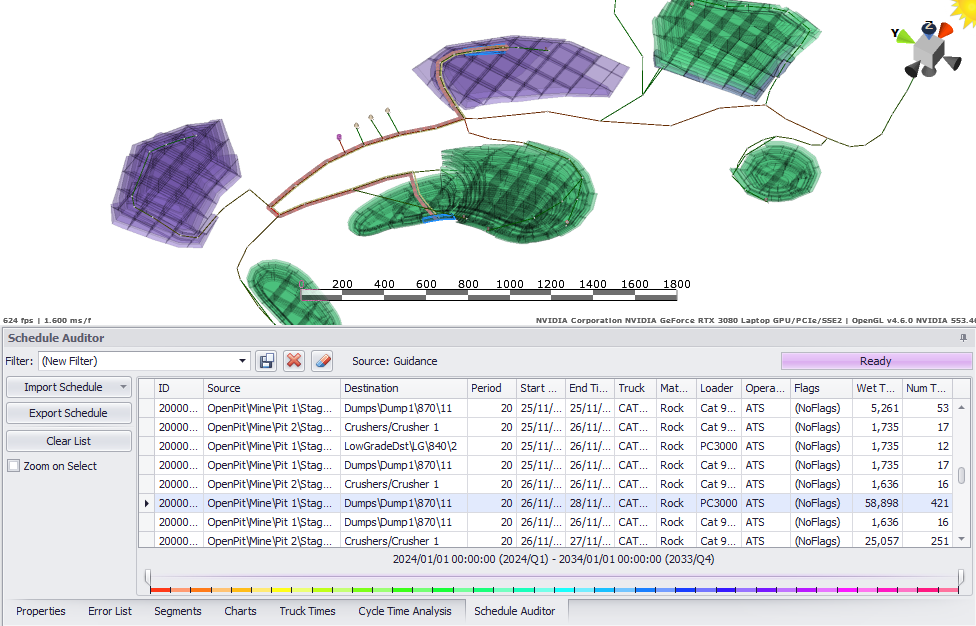On the Network tab > Display tab, you can now select Schedule Audit Mode as the display mode. This command will only work if you have imported scheduling blocks. The imported schedule is displayed line by line in the Schedule Auditor panel. Click on individual records to see the haul route highlighted on-screen and the state of the pit and dump at that point in time.
