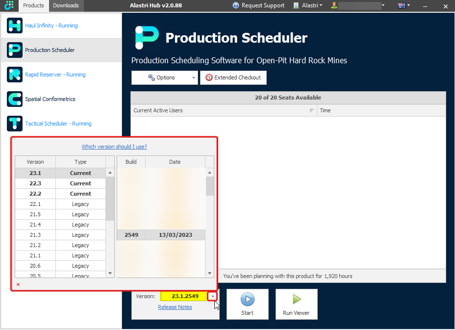In Versions drop-down you’ll see a list of major version types and build numbers and dates. You may select any version and build required for your operation. To choose a right version click on link provided at a top of drop-down or go to Which Version Should I Use? section of this documentation.