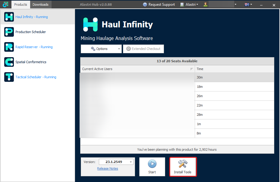 When selecting Haul Infinity app from a list of products you’ll see at a bottom Install Tools option. It is used to download and setup Alastri Haul Infinity Interoperability Client for the version selected.