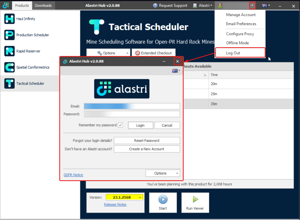 Close the Alastri Hub v.* log-in dialog by pressing the button.