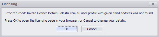 The internet licence authenticates your purchase key, name and email against your details on the Alastri server. Check for spelling errors in your email; if problem persists then contact Alastri support.