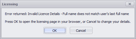 The internet licence authenticates your purchase key, name and email against your details on the Alastri server. Check for spelling errors in your name; if problem persists then contact Alastri support.