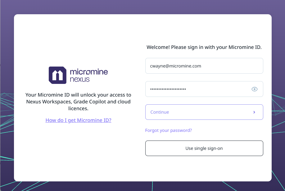 A Micromine ID is a convenient single account for accessing all services on the Micromine Nexus platform. Your Micromine ID will be created for you from your email and a password when you set up a cloud licence or any feature which requires the cloud and an ID, such as Nexus Workspace. If you would like to use any of the cloud-enabled features and you have not been assigned a Micromine ID, contact Support at support@micromine.com to get started.