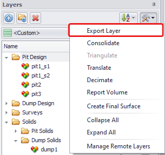 In Rapid Reserver, you can export files, surfaces and solids, reserves, mappings, bench and report templates, as well as polygons and construction lines.