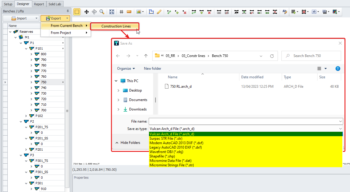 In the Designer tab > Benches/Lifts panel, press the Export button provided for exporting Alastri Inventory Model (see Alastri Inventory Model) Construction Lines, Reserves, Named Blast and Dig Polygons and Solids for further mine planning and operational activities.