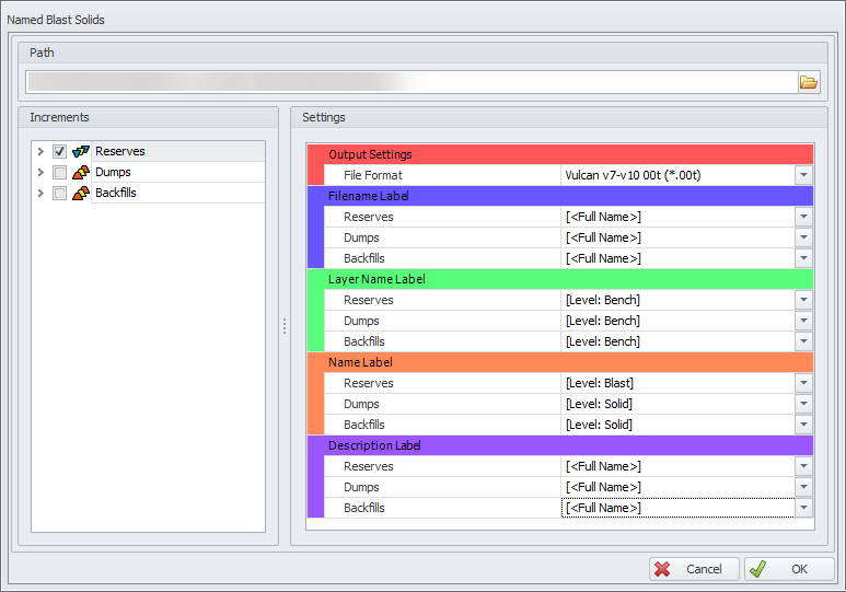 Use the drop-downs to select a filename label* for: Reserves, Dumps and Backfills. A label has to be selected for each table, even if its increments are not included in the export. Otherwise, you’ll get an error message prompting to map labels for each level. See the Notes below. |
