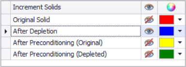 In the Increment Solids panel, you can select which dig solids to display in the viewport (Original, After Depletion, After Preconditioning), and change their colors to suit your preferences.