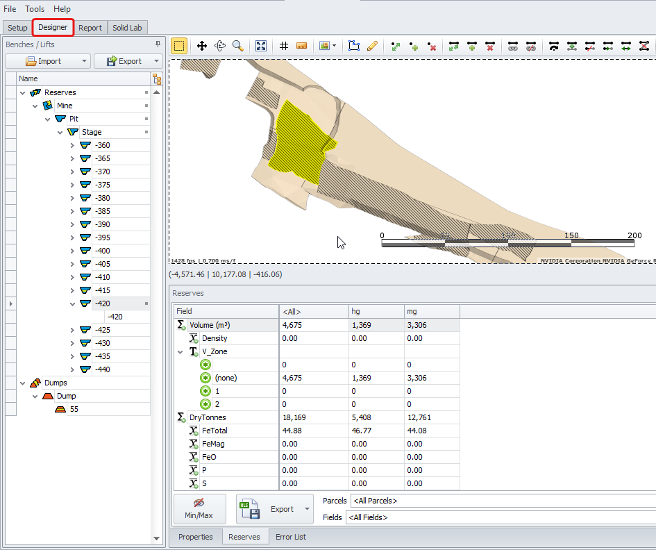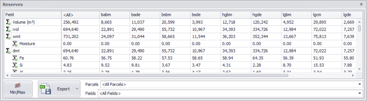 The Reserves panel provides detailed information on the material content in the selected parcels.