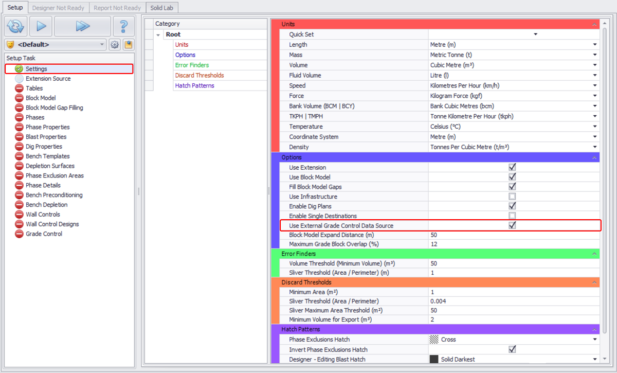 To display the Grade Control step in the Setup Task list, in the Settings step flag the Use External Grade Control Data Source option.