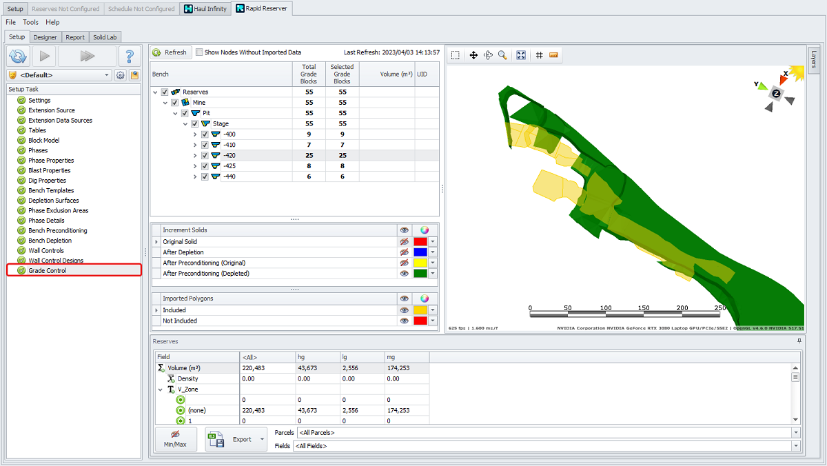 Make sure the material mappings in the Grade Control Database Material and Rapid Reserver Parcel columns are correct - they should match.