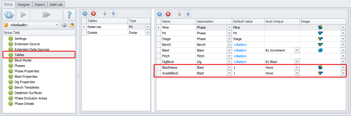 In addition to the current Reserves tables level names, the new level names “BlastName” (optional) and “GradeBlock” need to be added to prevent duplication of names. The new level fields will be associated with the Blast level and will have a default value of 1, which will be overwritten on import of the grade control database. The Auto Unique option can be set to “None”.