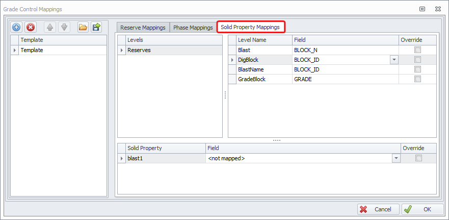 Add a template for grade control blocks mapping. To do this, click the blue plus button or import template from a “.GCMappings” file.