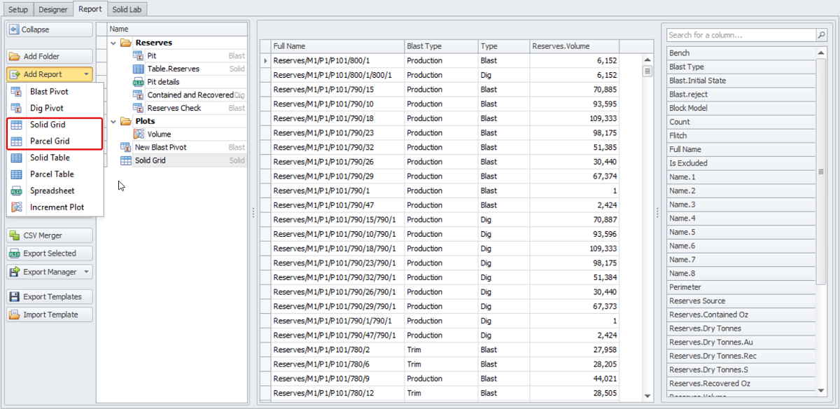 You may create a Grid type report for a Solid or for a Parcel by selecting the required option from the Add Report drop-down.