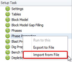 In Rapid Reserver, you can import files, surfaces and solids, Block Models, mappings, bench and report templates, as well as polygons and construction lines.