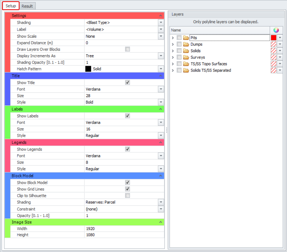In the Setup tab, set the display parameters for the different components.