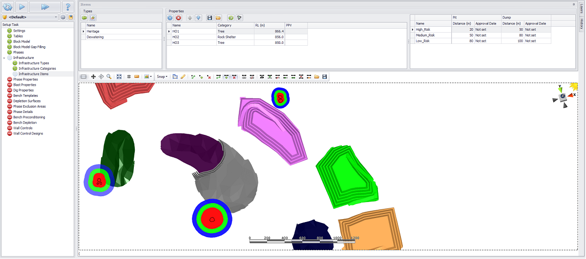 Material impacted by Infrastructure sites can be set up to have approval dates or set up to be entirely prohibited. This data flows into ATS, where it can be used as an input into the mine plan. Material affected by approval dates will only be released into the scheduling inventory once the approval date has elapsed. Material flagged as prohibited will not be allowed to be mined. This functionality greatly increases mine plan accuracy and reduces the risk of mining in close proximity to infrastructure sites.