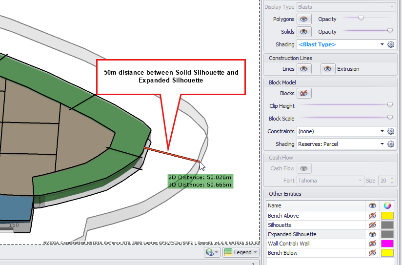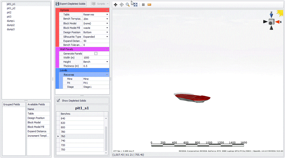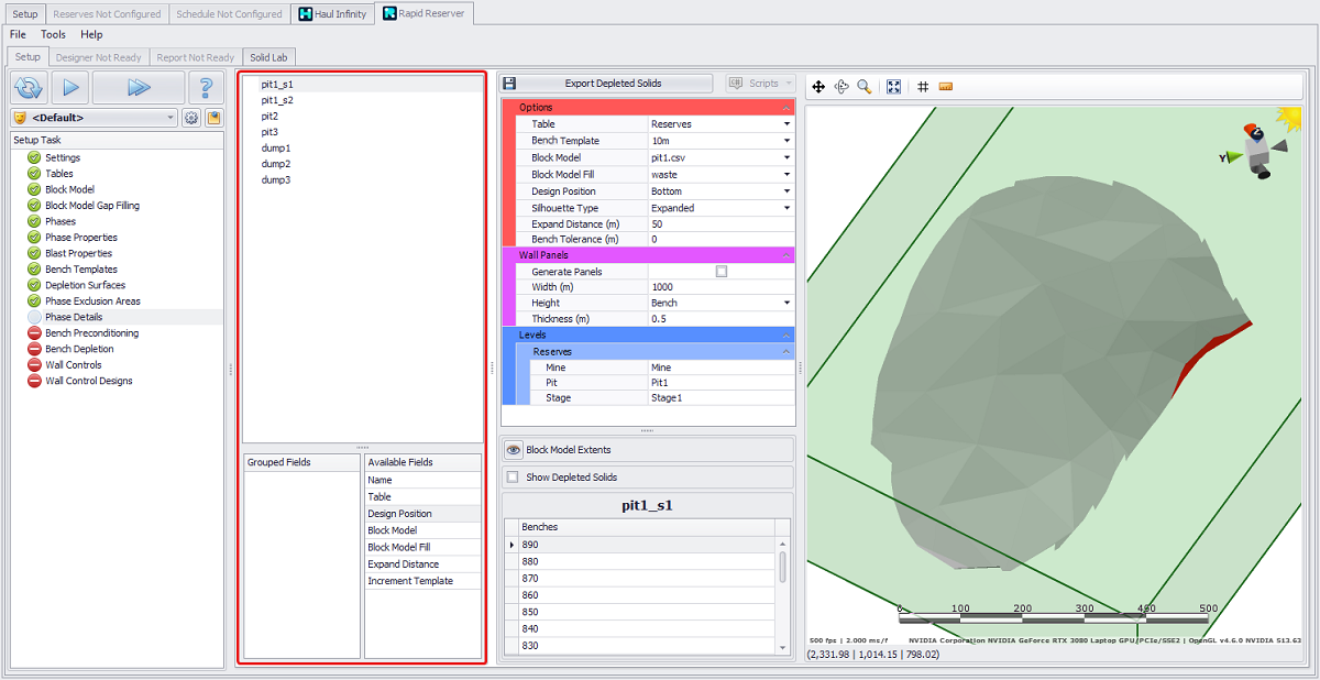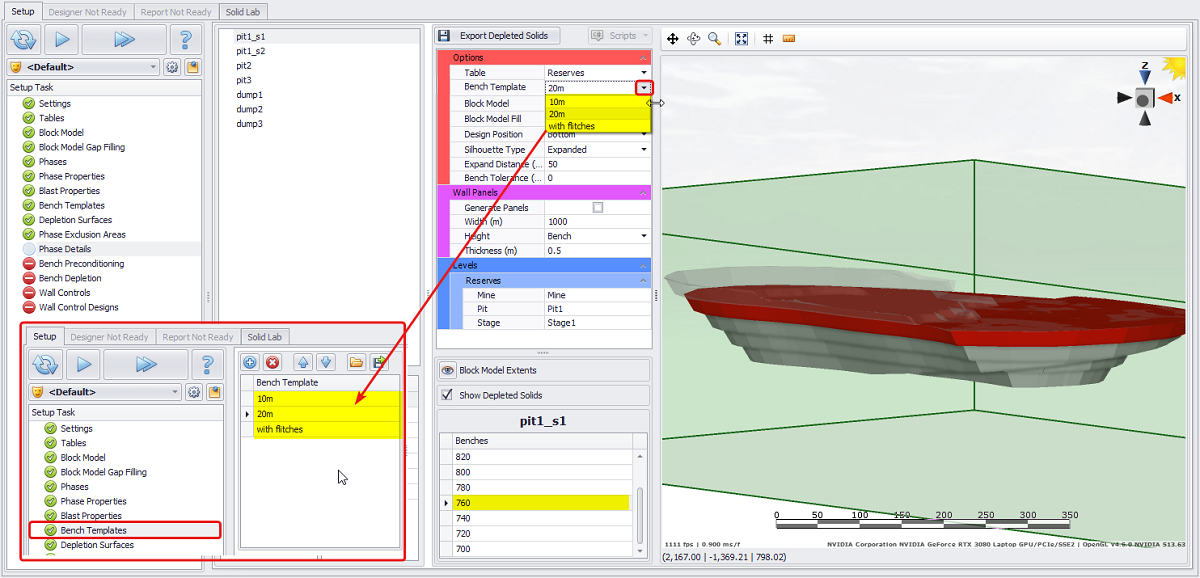 To make sure that the Bench Template has been set correctly, review the levels heights listed in the Benches panel for each phase. The selected bench level will be shown in red in the viewport. If the bench template doesn’t match the pit benches, you may need to try another Increment Template, or navigate back to the Bench Templates step and make some changes there. |