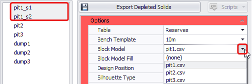 Specify which block model to reserve from. Applies to pits only, for dumps leave default "none". Check the Block Model Extents to make sure that you are selecting the right block model. In the example to the right, block models for pit2 and pit3 are not convenient for pit1, as they are covering other areas. |