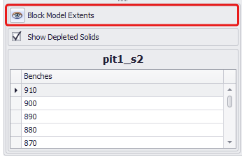 The extents of the selected block model is denoted by a green bounding box. Use the Block Model Extents toggle to display or to hide it.