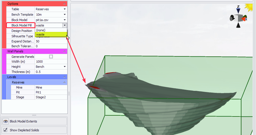 Specify material to fill block model gaps with. This is useful where the current mining solid surface is outside of the Block Model extents. Applies to pits only, for dumps leave default "none". Block Model Fills available from the drop-down are configured in the Block Model Gap Filling step. |