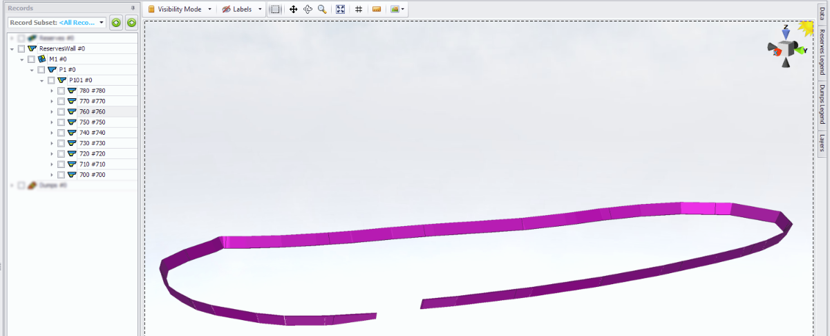 It is important to note that even though the wall panels are created within Rapid Reserver, they cannot be viewed until the Initial Database step in Alastri Production Scheduler. The wall panels will be displayed in the Record tree under their own category, separate from the mining solids. |