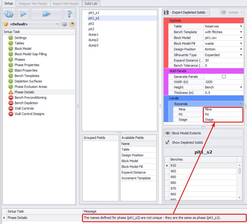 Different phases have the same level names. Example, during the initial setup each Reserves phase has default names “Mine”, “Pit”, “Stage”. When using multiple Reserves phases, they all will have the same name and have to be renamed. |