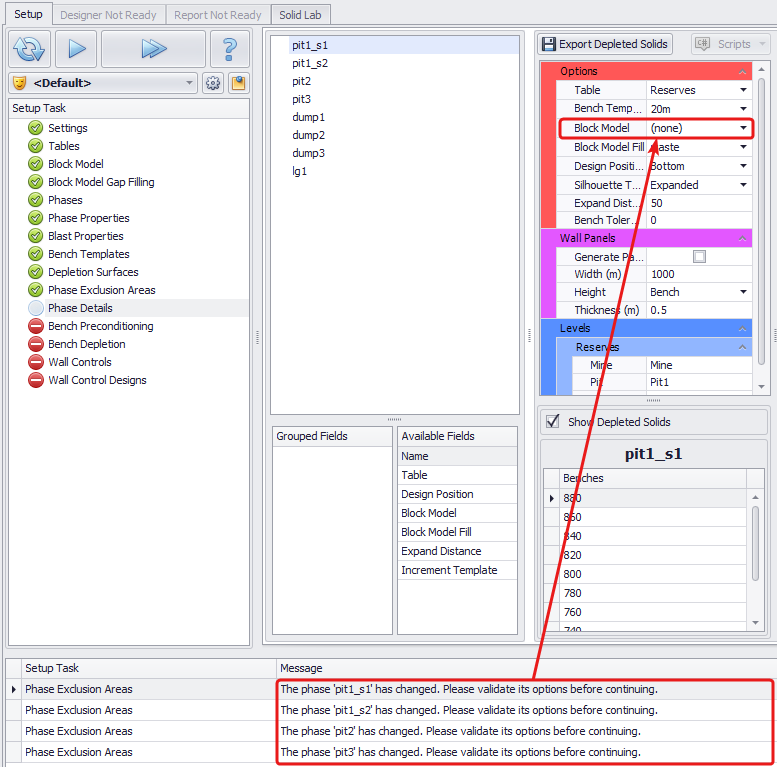Changes have been made to the phase configuration, ie. Block Model, Gap Filling material, Phase solids. |