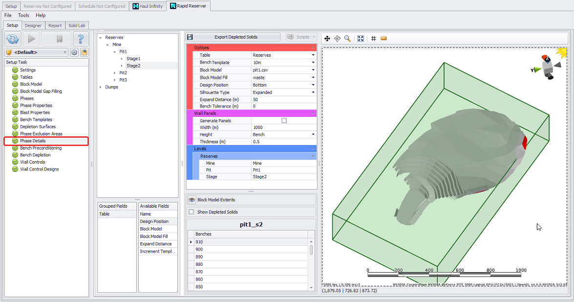 In the Phase Details step you may set the table, block model, bench template, and other default properties for each phase.