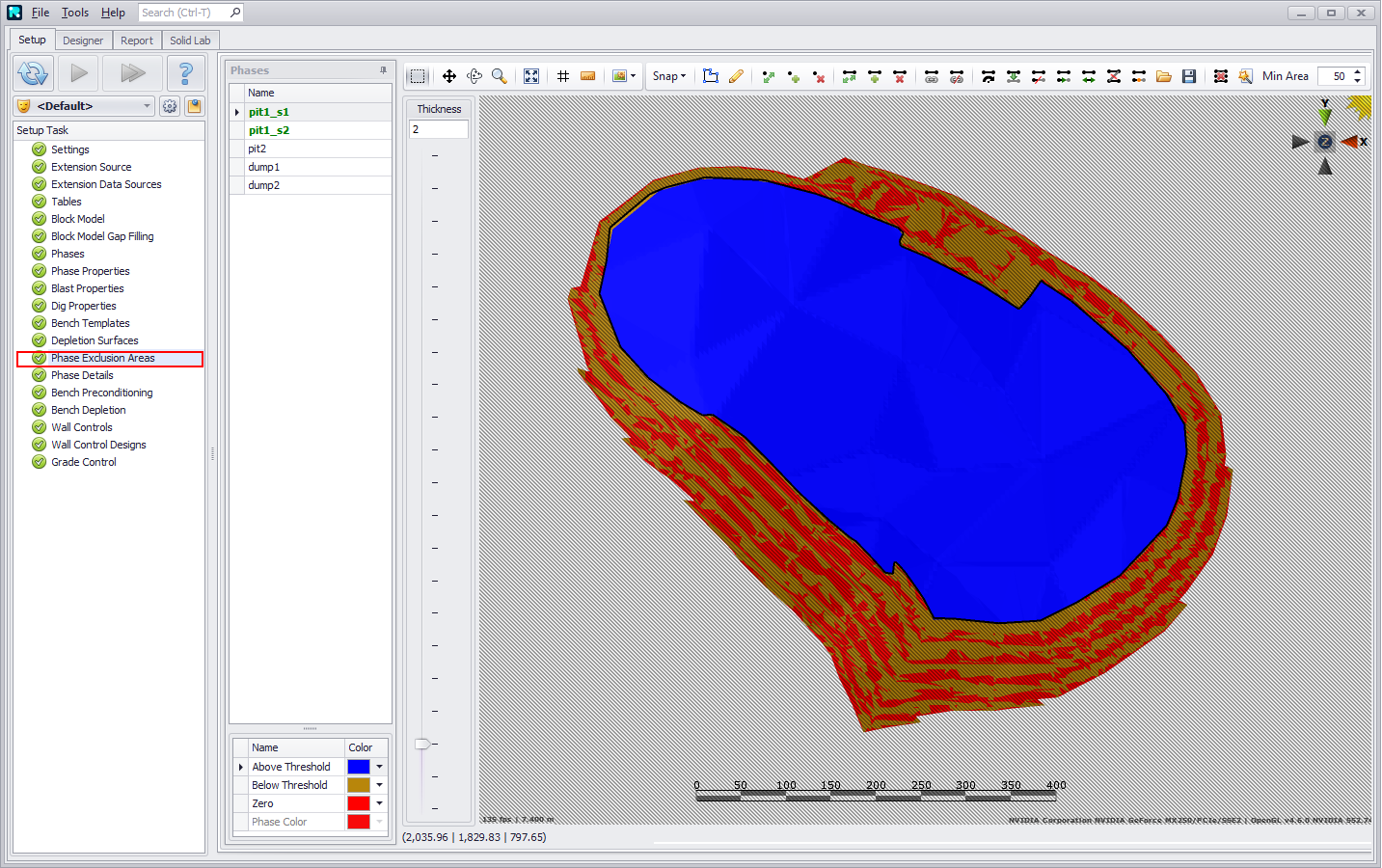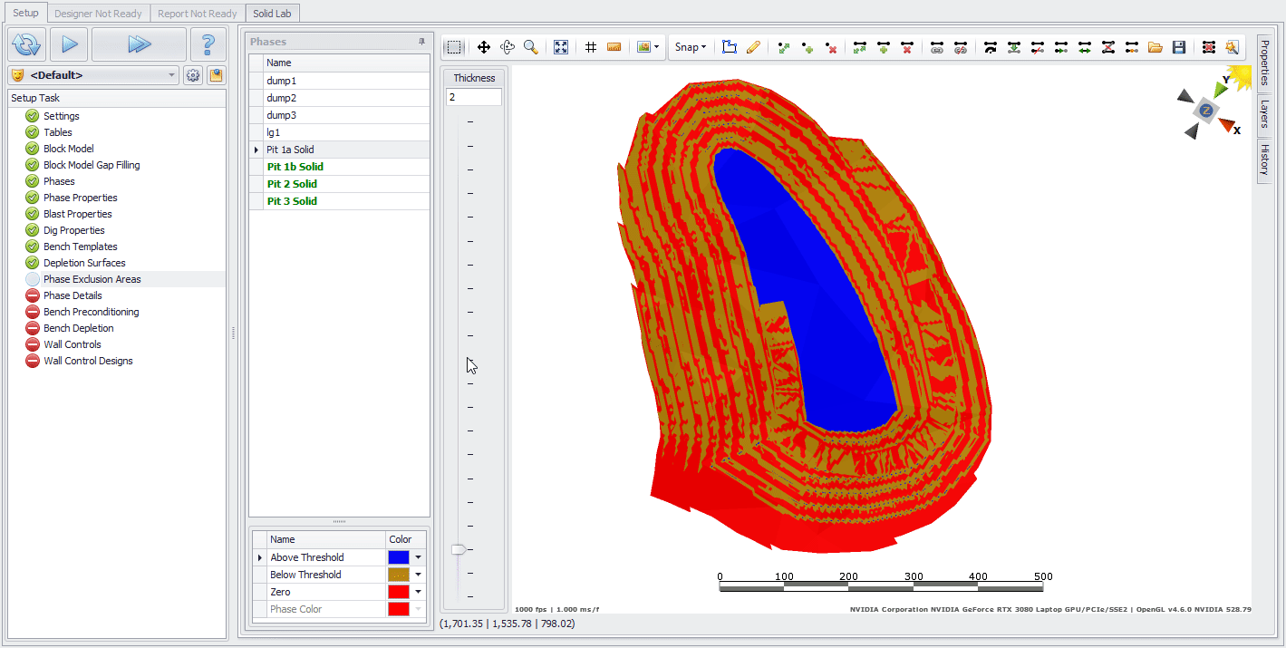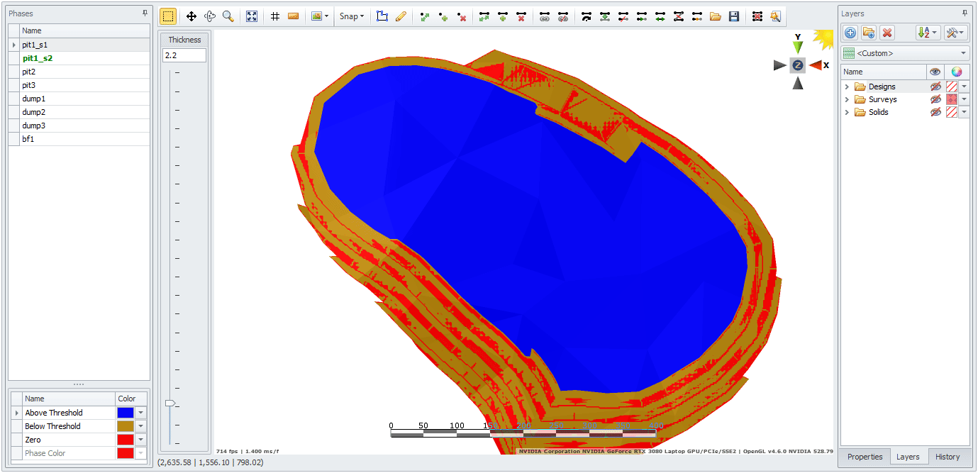 The phase solids can be cut with up-to-date depletion surfaces, these can be applied to the top of a pit phase or the base of a dump.