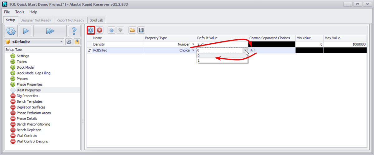 User specified values in Phases/Blast/Dig Properties setup steps |