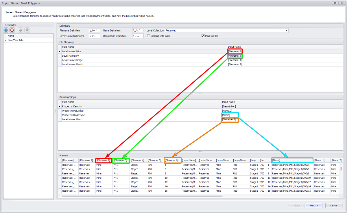 Review the mapping template to choose which files to be imported into which benches/flitches, and how the blasts/digs will be named.