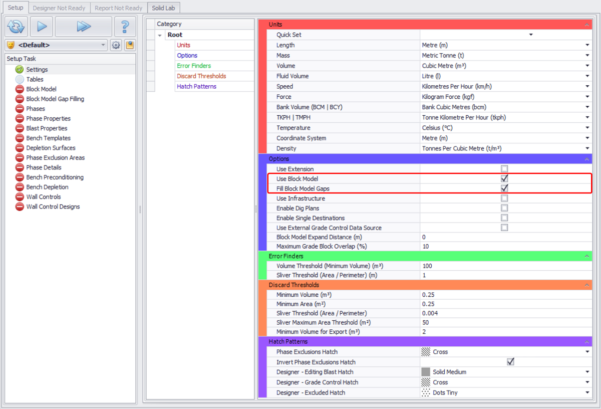 Depending on which options are ticked in the Options section, different steps appear in the Setup Tasks list. In the current project, will need the Block Model and the Block Model Gap Filling features.