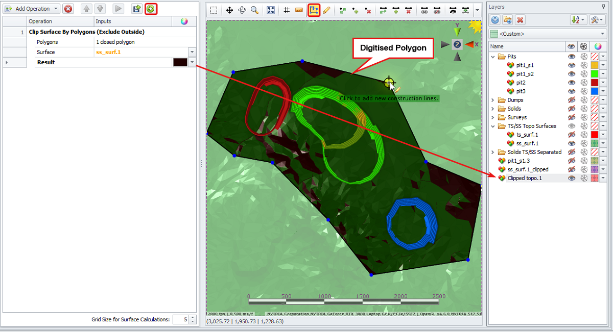 Sometimes you may need to schedule topsoil and subsoil separately from the main pit volume, to allow for the further rehabilitation. In this case, you can create a discrete surface a given number of meters below the topography, and use it to generate a topsoil solid, to which you can assign its own parcel and scheduling logic.