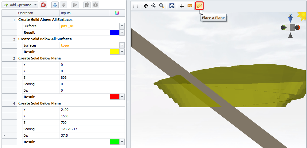 Use the Place a Plane tool from the top toolbar. Left click and rotate as required to determine the position for backfilling within the pit stage design.