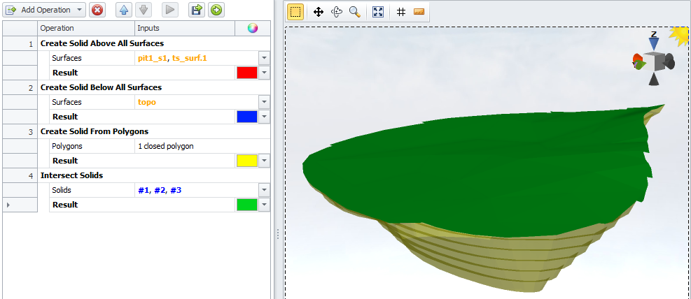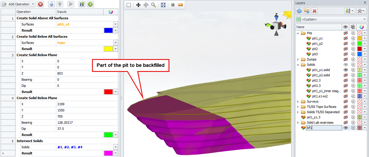 Below is an example of generating a backfill stage solid, which can come in handy when a certain part of the pit is fully mined and can be backfilled with a waste material.