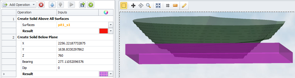 Define a plane by typing in X, Y, Z values, bearing and a dip. An upper surface is projected above this plane and a closed solid is triangulated. |