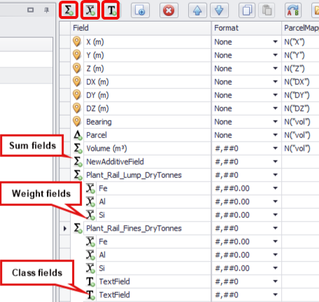 New reserve model fields can be created by clicking the Sum, Weighted, and Class icons located in the top button ribbon. These add new rows into the field list.