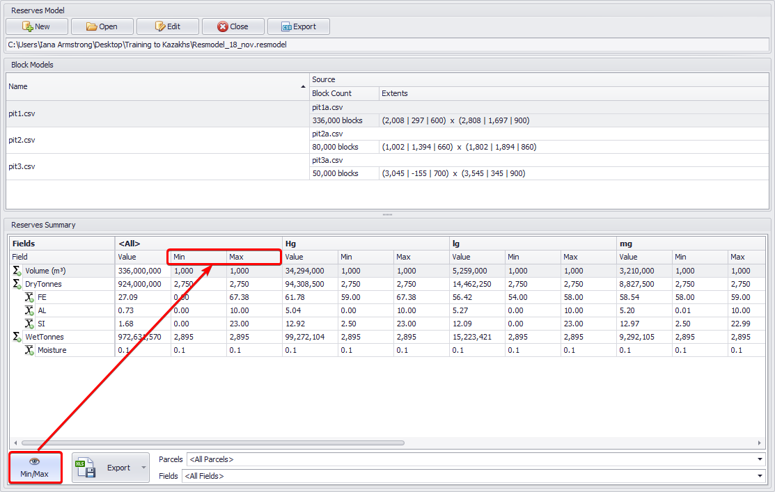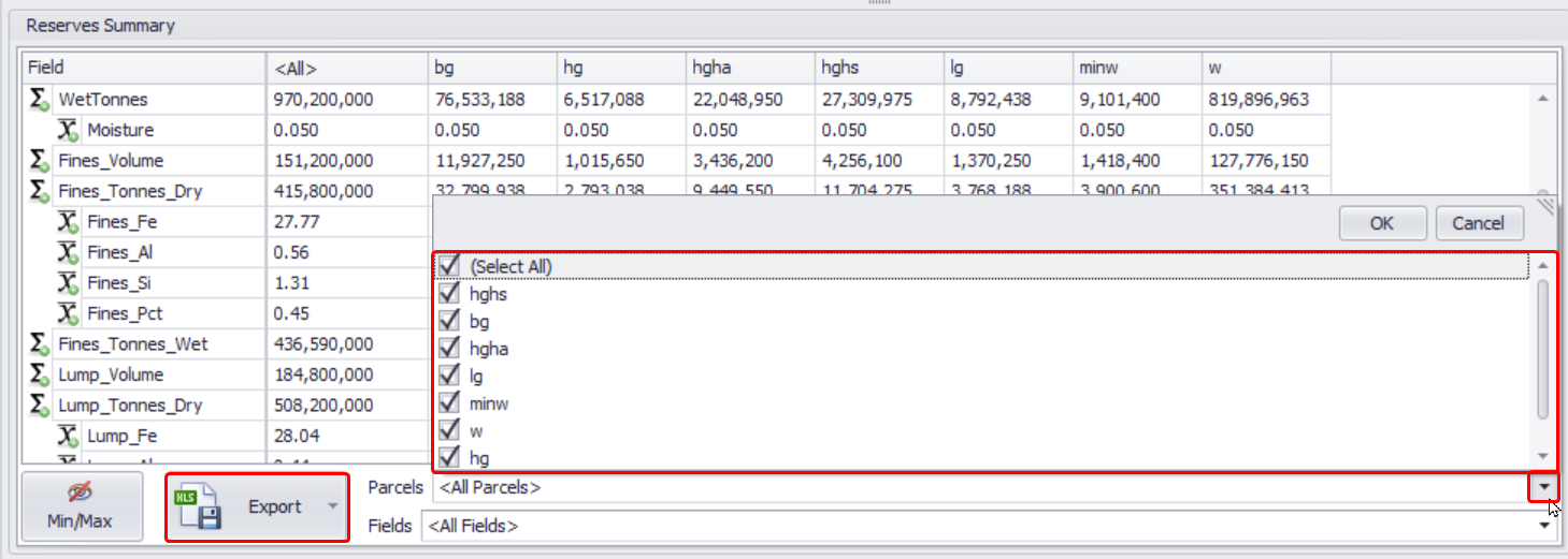 You can also narrow your Block Model Data export by selecting which parcels and fields you wish to export from the Reserves Summary.