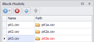 If in the Reserves Model Generator the name of a block model appears red, it means the absolute path to the file can’t be found. The path to the blockmodel must be relinked in order to use it.