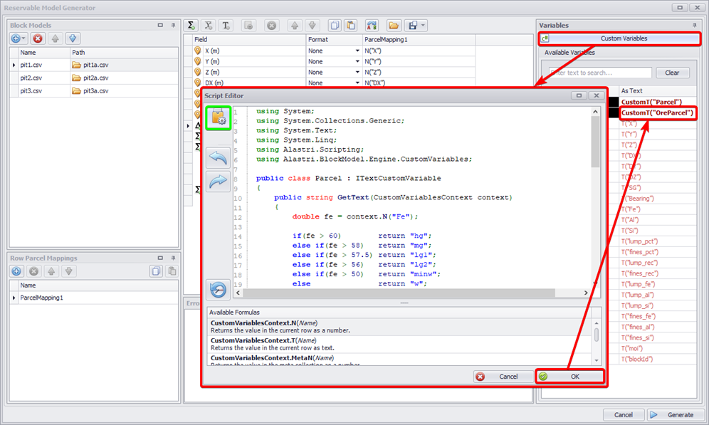 You can copy sample scripts from the Block Model Custom Variables section and paste them into the Editor window.