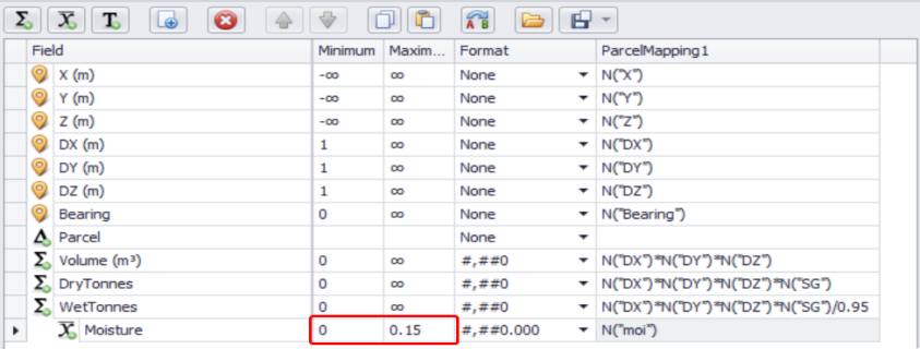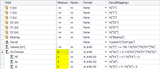 To prevent showing negative values, in the Minimum column, limit the lowest values to zeros. This way, even if minus values (-99 or -∞) are used in the Block Model fields, you will not have negative values displayed for reserves during further setup and scheduling.
