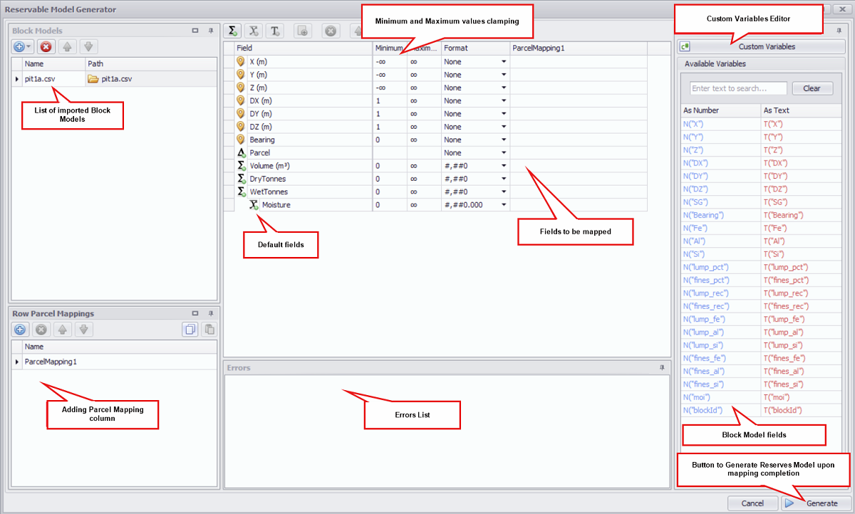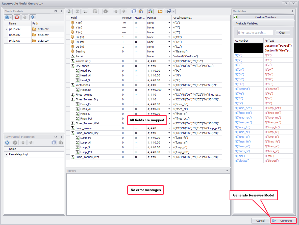 If the Errors panel is blank, and all relevant fields are mapped, press Generate to build the reserve model.