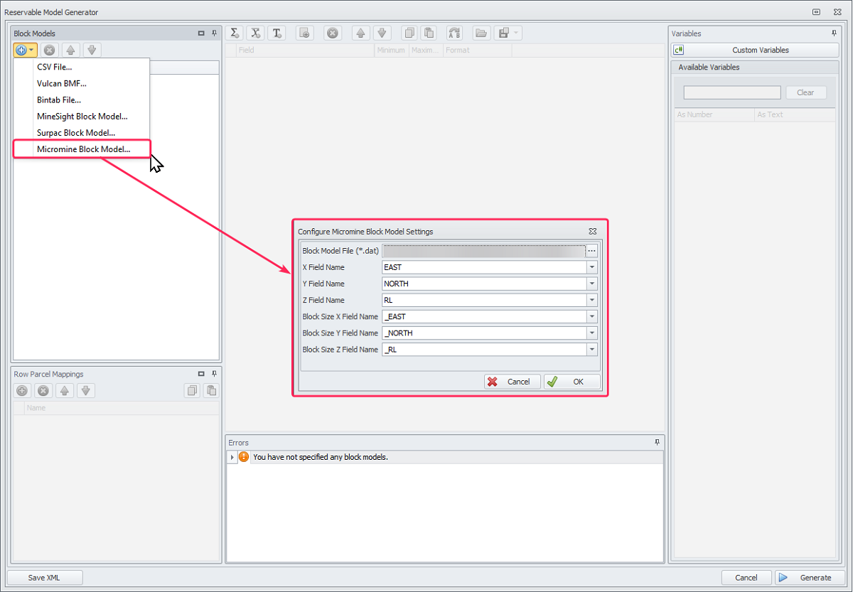 To import a block model in .dat format created in Micromine, select the option “Micromine block Model” and populate Configure Micromine Block Model Settings form.