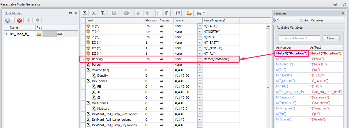 When importing Block Models in .DAT format, in the list of Available Variables on the right you will see a new variable MetaN(“Rotation”), which you do not see when working with a CSV file.