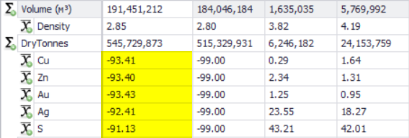 When aggregating multiple block model cells, the value of these fields will be summed together. Sum fields include quantity fields such as volume, tonnes and gold ounces. |