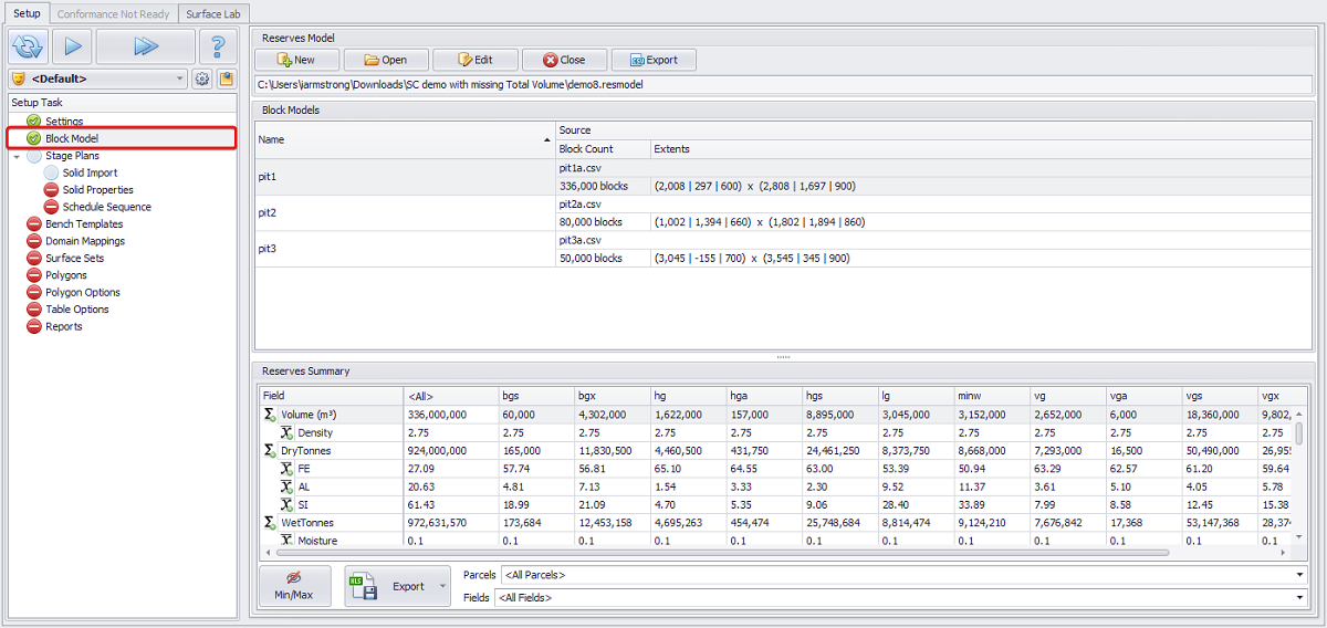 Once the Reserve Model file has been generated, a summary is displayed for each loaded Block Model.